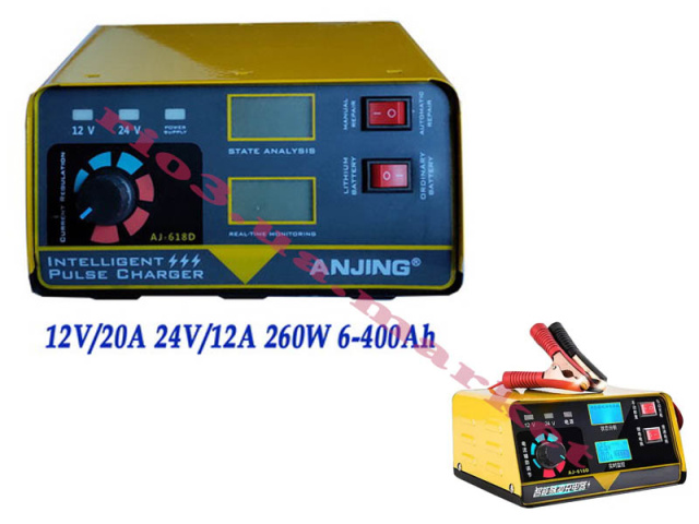 Автоматичний імпульсний зарядний пристрій ANJING AJ-618D застосовується для зарядки 12/24В, 12-400Ач свинцево-кислотних, сухих, рідинних, літієвих батарей.