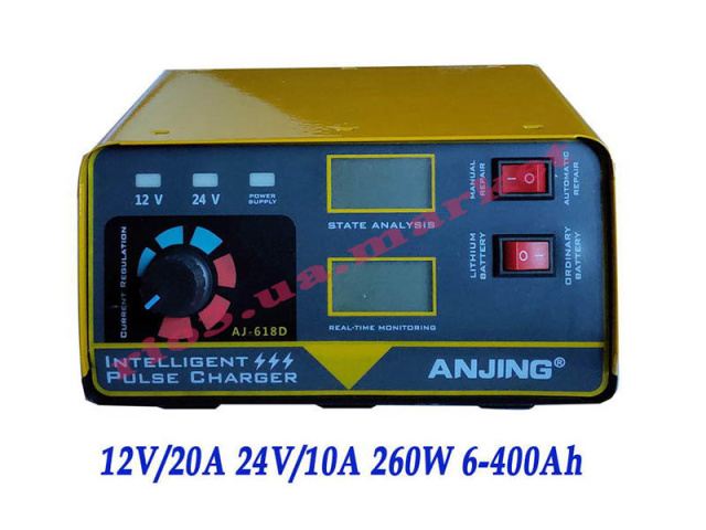 Автоматичний імпульсний зарядний пристрій ANJING AJ-618D є розширеною і потужнішою версією повністю автоматичних зарядних пристроїв. Потужність цього пристрою становить 260 Вт а максимальний струм зарядки при напрузі 12В - 20А. Залежно від вибраного Вами режиму роботи пристрою - заряджання або відновлення акумулятора, Ви можете вибирати в ручному режимі величину сили струму і напруги.