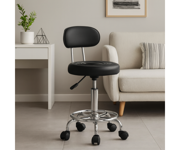Крісло на колесах, обертається на 360 градусів, піднімається вгору вниз, зручне кругле сидіння, матеріал сидіння м'який поліуретан, матеріал спинки шкірозамінник, крісло регулюється по висоті, піастровий механізм дозволяє регулювати крісло лише по висоті. Він являє собою блок з важелем керування газліфтом (підйомний механізм з газовою пружиною). Натисканням на важіль відкривається клапан у газліфті, в результаті чого рухається поршень і регулюється комфортна висота сидіння, металева основа з хромованим покриттям, є підставка для ніг, поліуретанові колеса, розмір крісла: діаметр сидіння 32 см, товщина сидіння 6 см, ширина спинки 35 см, висота спинки 15 см, висота спинки від сидіння до верхнього краю спинки 30 см, висота посадки регулюється від 47 см до 59 см, висота регулюється від 76 см до 90 см, діаметр хрестовини 37 см. Кількість у коробці: 2 од.