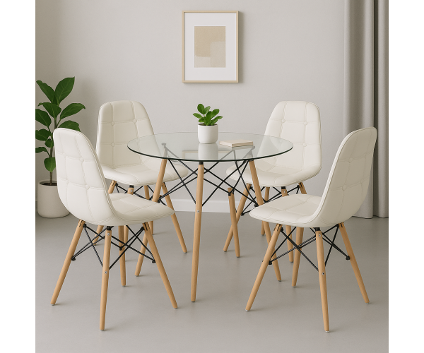 Стілець м'який, матеріал екошкіра, ніжки дерев'яні, дерево натуральний бук, світлий відтінок, покриті прозорим акриловим лаком, розмір стільця: ширина сидіння 46 см, глибина сидіння 42 см, висота стільця до спинки 82 см, висота від підлоги до сидіння 43 см. Цей стілець придумали більше півстоліття тому і він досі залишається одним із найзручніших стільців у світі і саме з нього почалася модана доступні дизайнерські меблі. Унікальність стільців у стилі Eames – це висока функціональність та універсальність сучасного стилю, що дозволяє використовувати його в абсолютно різних за дизайном та призначенням приміщеннях. Кількість у коробці 4 од.
