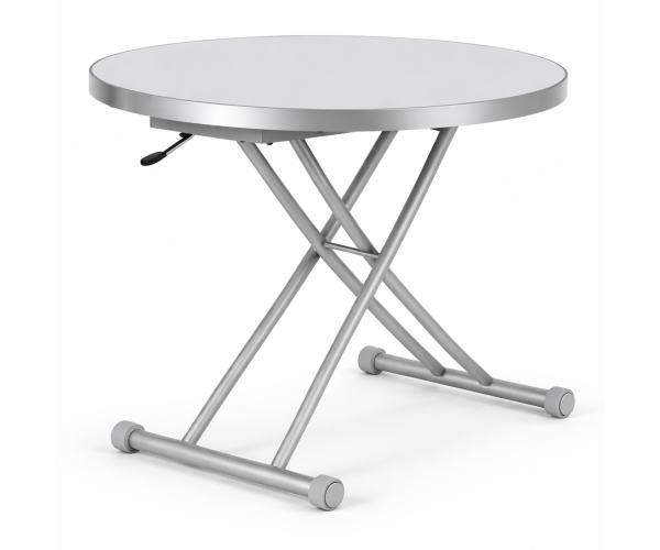 Стіл обідній розкладний трансформер, круглий 90 см, розкладний, стільниця з дерева мдф 15 мм завтовшки, зверху скло, товщина скла 6 мм, колір стільниці білий, ніжки металеві фарбовані, колір сірий, на ніжках внизу накладки для захисту підлоги, колеса з механізмом блокування, стіл піднімається вгору і опускається, регулювання висоти від 30 см до 74 см, перетворюючись в обідній стіл за допомогою механізму, стільниця розкладається, розмір столу: діаметр 90 см, в складеному вигляді ширина стільниці 59 см, висота обіднього столу 74 см, висота журнального столу регулюється за вашим бажанням.