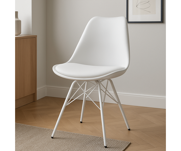 Стілець пластиковий, матеріал поліпропілен, на сидінні м'яка подушка зі шкірозамінника, ніжки металеві фарбовані, колір білий, розмір стільця: ширина сидіння 50 см, глибина сидіння 46 см, висота від підлоги до верхнього краю спинки 80 см, висота від пiдлоги до сидіння 47 см, розмір м'якої подушки зі шкірозамінника 44 см ширина і 39 см глибина. Стілець Тау - ідеальний вибір для тих, хто цінує простоту, стиль та комфорт. Завдяки своїм обволікаючим лініям, лаконічним формам та збалансованим пропорціям стілець Тау стане яскравим акцентом у будь-якому інтер'єрі. Він ідеально впишеться як у сучасний, так і класичний дизайн, додаючи йому елегантності та стилю. Кількість у коробці 4 од.