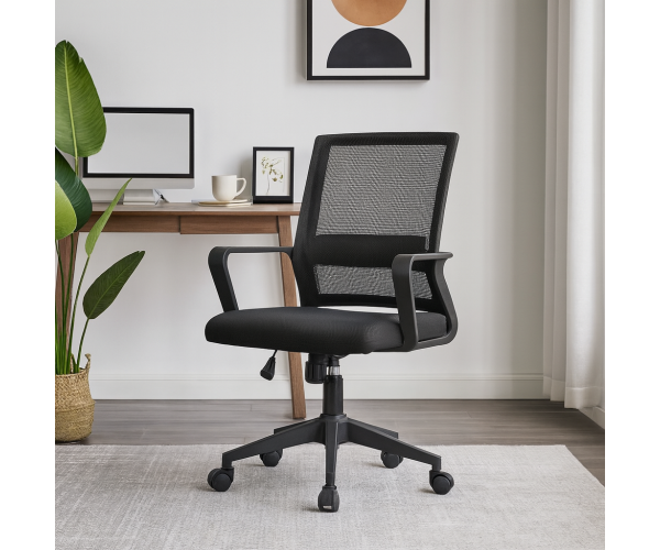 Сучасне офісне крісло, середня спинка з чорної сітки mesh, м'яке сидіння з чорної акрилової тканини, пластикові підлокітники чорного кольору, піднімається за допомогою газліфта, механізм tilt з регулюванням висоти та жорсткості розгойдування, фіксації крісла в робочому вертикальному положенні, зручне та гнучке налаштування під вагу людини, чорна поліпропіленова основа з додаванням скловолокна, що робить її особливо міцною, обгумовані колеса, ширина сидіння 55 см, глибина 58 см, висота від 88 см до 98 см.