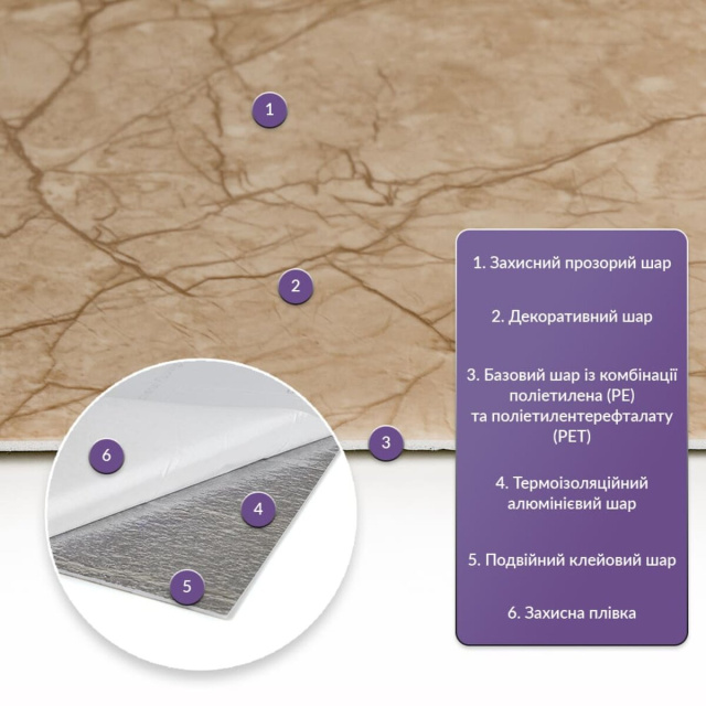 Як і в натуральних матеріалах, малюнки РЕТ плиток можуть трохи відрізнятися між собою, зберігаючи при цьому загальний дизайн та колір, що ще більше підкреслює природну імітацію. Також просимо взяти до уваги, що виробник має право змінювати зовнішній вигляд товару, зокрема відтінок та малюнок, на власний розсуд і без попереднього повідомлення.Шари матеріалу: