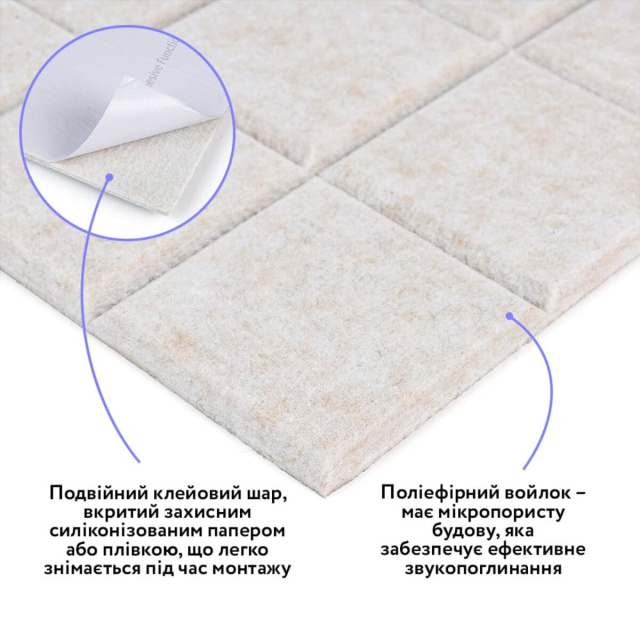 Самоклеящиеся звукоизоляционные панели — это многослойный отделочно-функциональный материал, предназначенный для снижения уровня шума и улучшения акустики помещения. Основу панелей составляет прессованный полиэфирный войлок, который обеспечивает эффективную звуко- и дополнительную теплоизоляцию, сочетая лёгкий вес с высокой устойчивостью к деформациям. Благодаря клеевому слою панели быстро монтируются, а однотонная поверхность с выразительным 3D-эффектом (под рейку или кирпич) объединяет технические свойства с современным декоративным внешним видом.