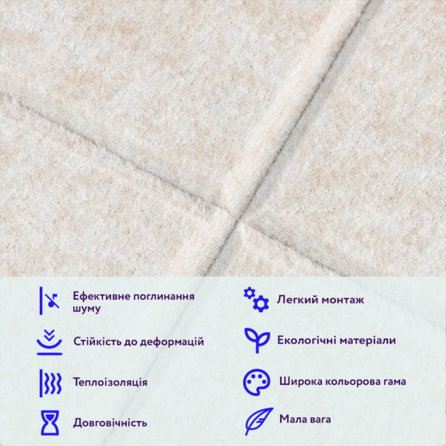 Эффективное поглощение шума: плотная волокнистая структура панели поглощает звуковые волны и снижает эхо, создавая более тихую и комфортную атмосферу для работы, отдыха или развлечений.