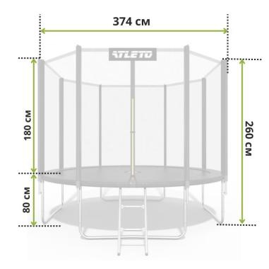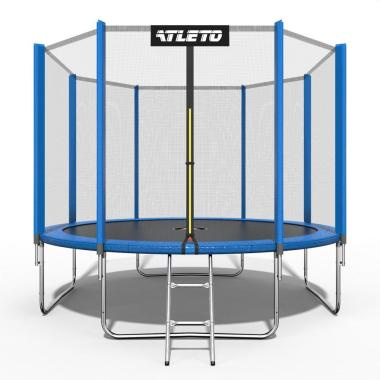 Батут Atleto 374 см (12 ft) з зовнішньою сіткою виготовлений з високоякісних матеріалів, що забезпечує його довгий термін служби. Батути є безпечними для користувача, так як конструкція закріплена таким чином, щоб захистити від травм. Батути створені відповідно до стандартів безпеки, встановленими в ЄС.