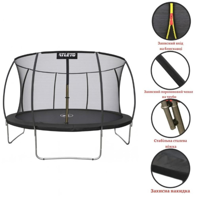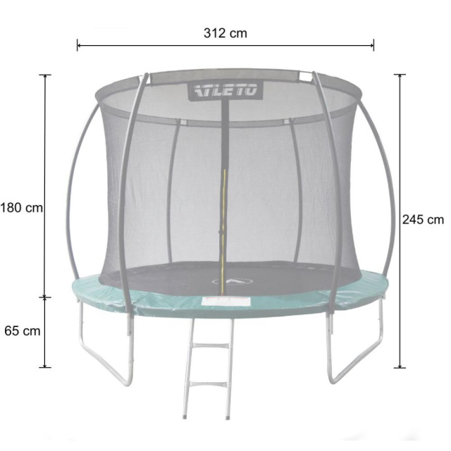 Батут Atleto 312 см (10 футів), що виробляється з високоякісних матеріалів, що забезпечує його довгий термін служби. Батут є безпечним для користувача, так як конструкція закріплена таким чином, щоб захистити від травми. Батути створені згідно з стандартами безпеки, встановленими в ЄС.