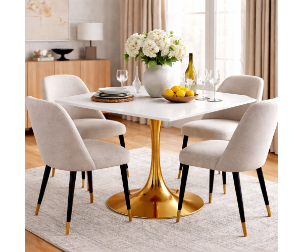 Стіл обідній квадратний, стільниця з матеріалу HPL, колір білий, розмір 80*80 см, опора металева золотого кольору, діаметр внизу 50 см, квадратне...
